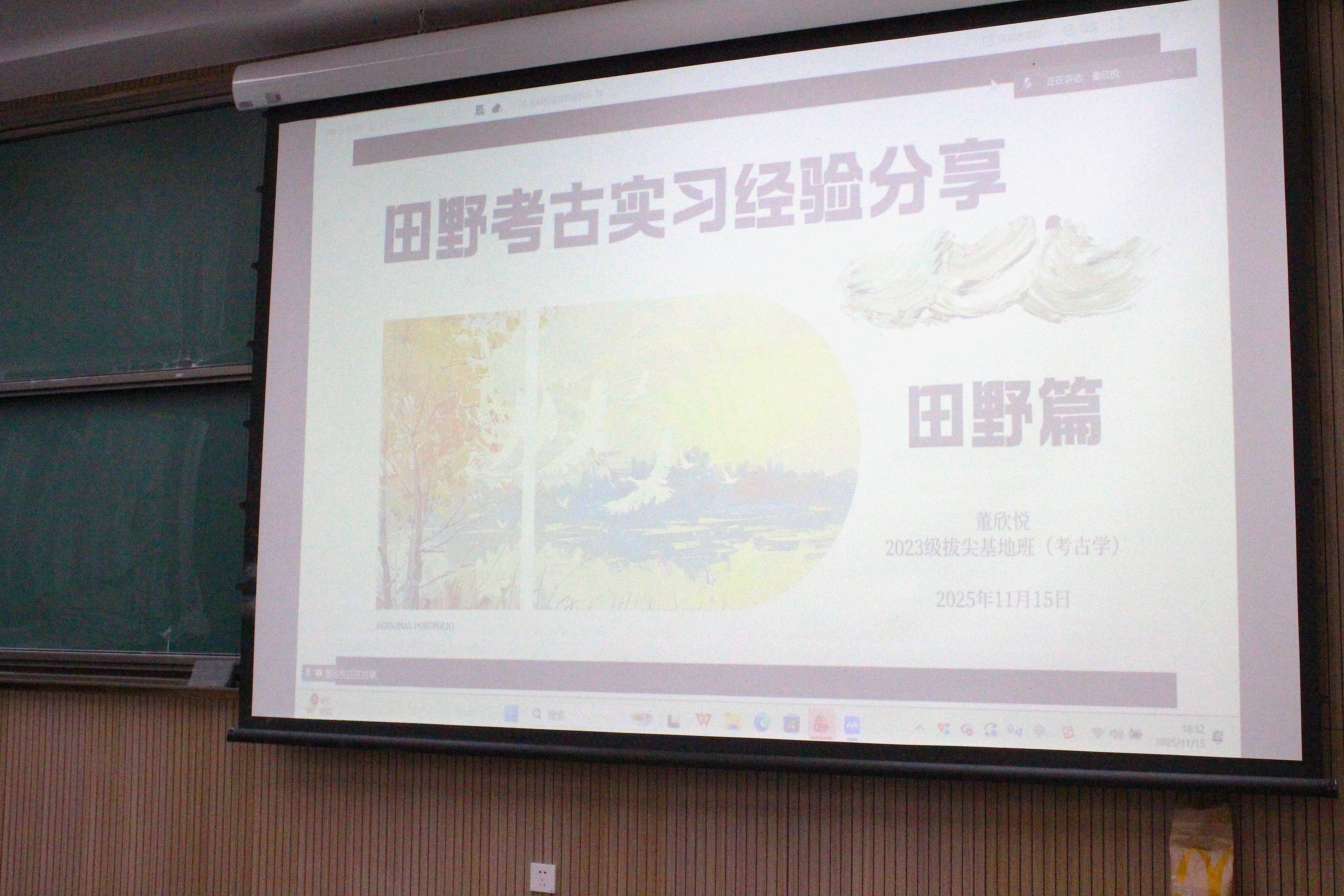 首先进行分享的是考古学专业的董欣悦。她从自身的田野实习经历出发,详细讲述了实习工作的全过程。她以自身田野实习经历为蓝本,生动还原了考古实习的完整流程,从初入田野的环境适应、实地发掘的工作方法,到团队协作中的人际沟通技巧,让在场同学对田野考古的真实场景有了直观认知。