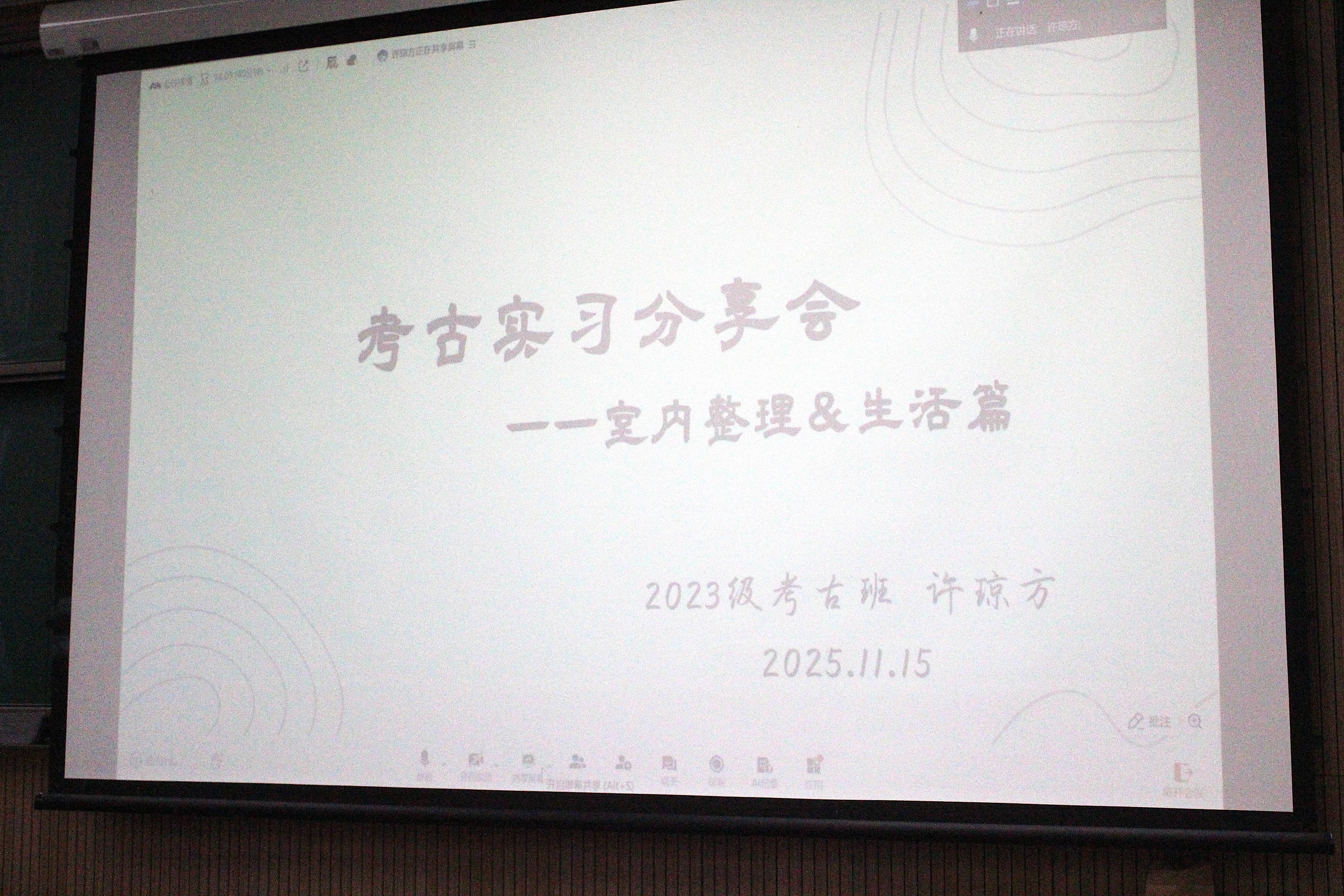 接下来,考古学专业的许琼方则从田野实习的室内整理和日常生活两大板块,为同学们分享了诸多实用经验。她详细介绍了室内文物整理、资料归档等核心工作,同时讲述了实习期间的生活环境与作息节奏。她特别叮嘱同学们,实习中要敢于主动提问、善于高效沟通、始终保持细心严谨,合理规划时间。